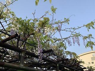 学校の藤棚が盛りを迎えています。白と藤色が三納小中学校の藤の花です。