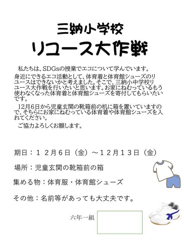 6年生の総合的な学習の時間に、エコ活動取り組んでいる児童がいます。その子どもたちが、体育服・体育館シューズのリユース活動を考えました。子どもたちの活動にぜひご協力ください。