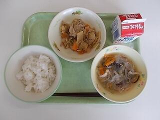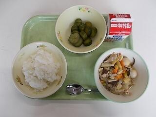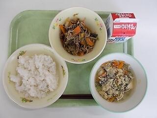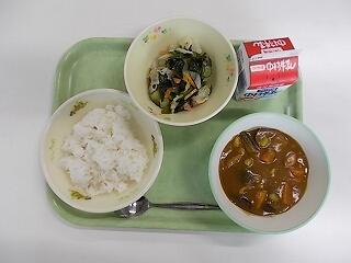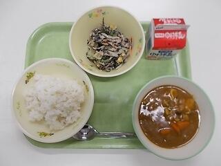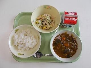 今日の献立は「麦ごはん きのこのカレー ひじきとごぼうのマヨネーズ和え」でした。