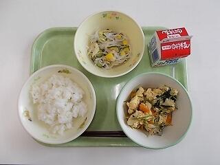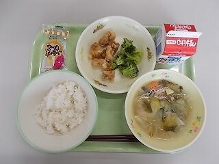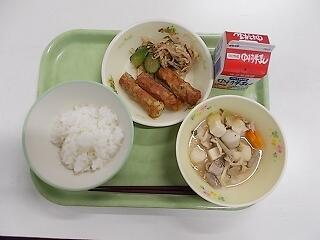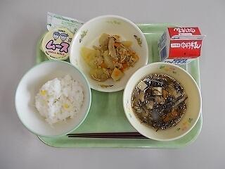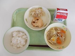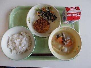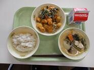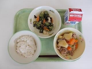 今日の献立は「白ごはん 豚汁 ちくわの磯辺揚げ(小学部2本、中学部3本) おかか和え」でした、