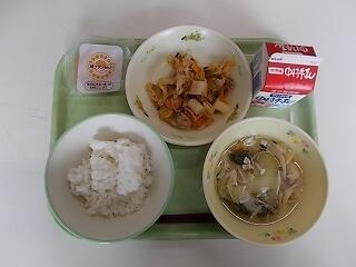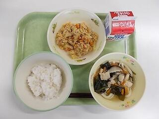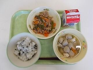 今日の献立は「救給五目ごはん 大根葉のみそ汁 いわしの甘露煮 みかんクレープ」でした。