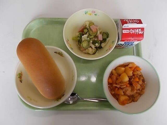今日の献立は「麦ごはん みやざきじどっこカレー カルシウムたっぷりサラダ」でした。