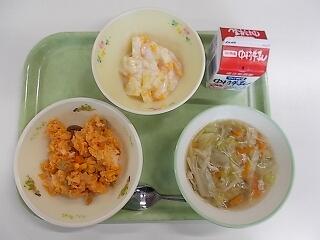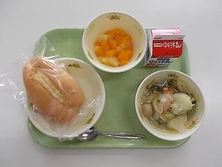 本日より、給食が再開しました。今日の献立は「食パン 千切り野菜のスープ 揚げ魚のたこ焼きソース いちごジャム」でした。
