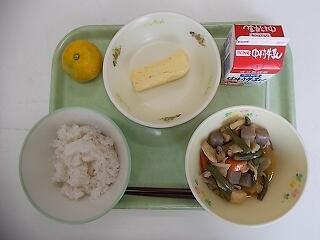 今日の献立は「麦ごはん 割干し大根の含め煮 厚焼き卵 みかん」でした。