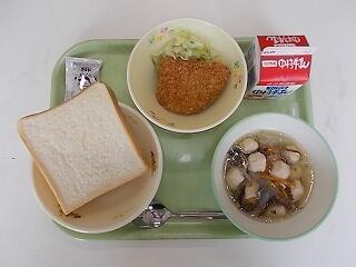 今日の献立「食パン 肉団子のスープ かぼちゃ挽肉フライ 添えキャベツ 黒豆きなこクリーム」でした。