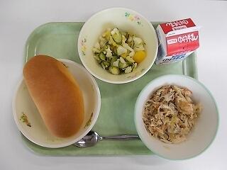 今日の献立は「ミニチーズパン ビーフン炒め 夏みかんのサラダ」でした。