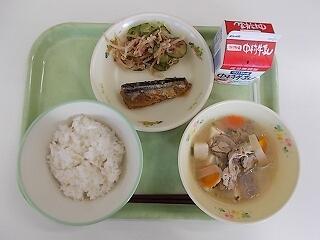 今日の献立は「麦ごはん 豚汁 さんまのみぞ煮 おかか和え」でした。