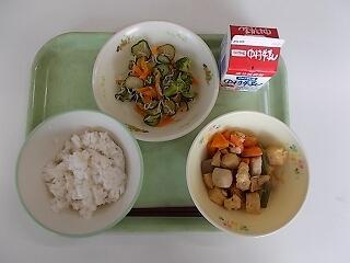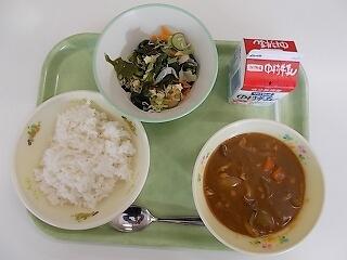 今日の献立は「麦ごはん 夏野菜カレー 海藻サラダ」でした。