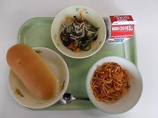 今日の献立は「ミニミルクパン スパゲッティミートソース 海藻サラダ」でした。
