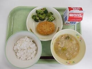今日の献立は「麦ごはん 豚肉とキャベツのみそ汁 かぼちゃコロッケ ゆでブロッコリー」でした。