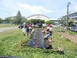 小学部2年生の子どもたちが、芋の苗植えをしました。先生から苗の植え方の注意点を聞き、しっかり茎の先端が土の中に納まるように土を押さえていました。秋には、おいしいサツマイモが食べられそうです。