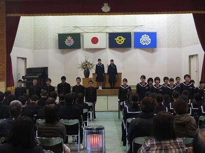 その後、校長先生から、「植物は、冬(増ゆ)の間に目には見えないけれど、エネルギーをしっかり増やす努力をしています。春(張る)にはエネルギーがいっぱいになって、張って張って耐えられなくなり、裂けてしまいます。その状態が咲く(裂く)ということだと考えます。植物が花を咲かせるように、今の学年での学びを進めてほしい。特に、中学3年生の皆さんは、自分の道に向かってしっかり花を咲かせてほしい。」という話がありました。