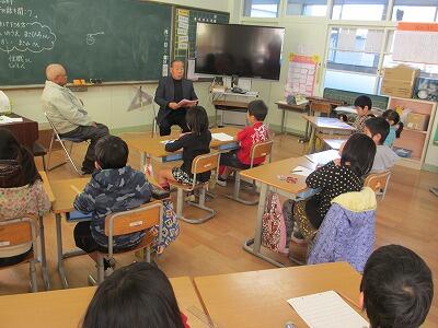 2月16日(火)の3・4校時に、小学2年生が生活科の「三納の昔話を聞こう」という学習で、実際に地域の井上さん、甲斐さんをお迎えして、お話をしていただきました。戦争中の食べ物や学校のこと、人々の生活の様子などについてのいろいろなお話を身振りや手振りを交えたり、黒板に図を書いたりしながら、わかりやすく教えていただきました。特に、学校の様子については、今と昔の校舎の違いやチャイムの代わりに手で鐘をたたいていたこと、児童数が1学年で150人以上いたことなど、詳しくお話をしていただきました。