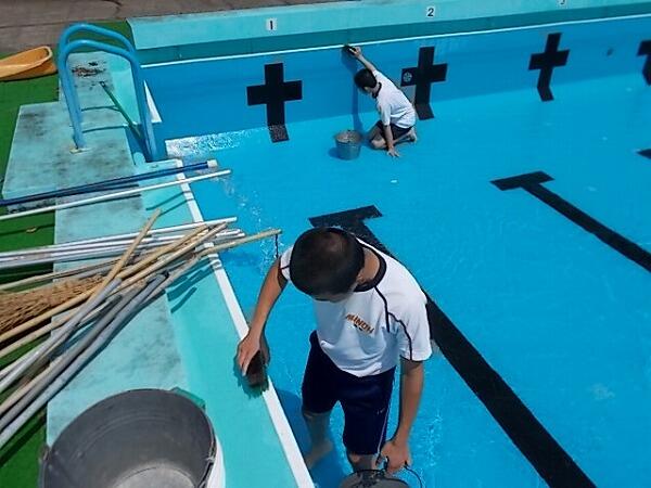 6月第2週からのプール実施(予定)に備えて、プール掃除をしました(中学部3年生)。落ち葉もなくなりだいぶきれいになっていました。まだ、少し水は冷たいようです。おかげで、きれいなプールで授業ができそうです。