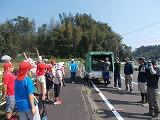 クラスみんなでつくった3体のかかしを学校から田んぼまで