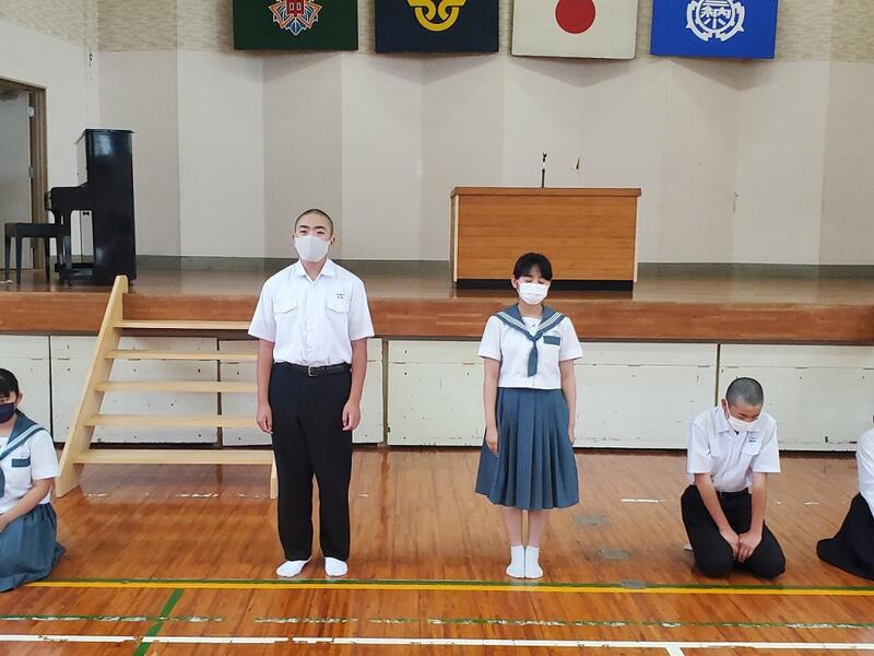 本日の5校時に西都児湯地区総合体育大会の選手激励会が行われました。3年生にとって最後の大会を迎えるにあたって、今年度は出場する各部活動の主将だけでなく、3年生全員が一言ずつ「決意の言葉」を述べました。