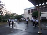 雨上がりのタイミングでの登校と、中学生によるボランティアの様子です。
