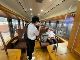乗り込んだ生徒たちは、座席を対面にしたり、写真を取り合ったりしています。