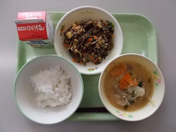 中学部の献立は「麦ご飯、キムチトックスープ、ビビンバ」でした。