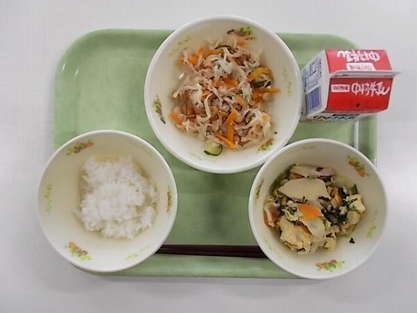 小学部の献立は「麦ご飯、高野豆腐の卵とじ、まだかづけ」でした。