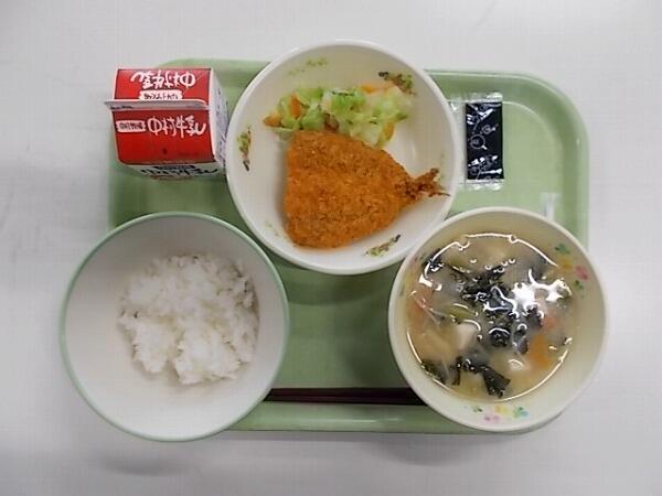 中学部の献立は「麦ご飯、あじフライ(添えキャベツ)、小松菜の味噌汁、ウスターソース」でした。