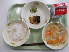 小中学部同じ献立で「麦ごはん、呉汁、さばみぞれ煮、キュウリの即席漬け」でした。