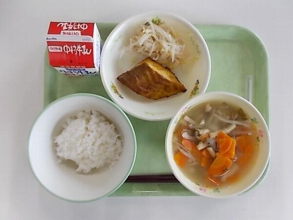 小中学部同じ献立で「白ご飯、白玉団子汁、鯛のカレー風味焼き、ゆでもやし」でした。