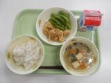 小中学部同じ献立で「麦ご飯、なすの味噌汁、塩唐揚げ、枝豆」でした。