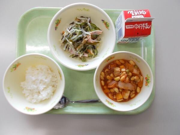 小学部の献立は「麦ご飯、大豆のチリソース、ひじきと野菜のナムル」でした。
