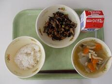 小中学部同じ献立で「麦ごはん、いももち汁、ひじきと厚揚げの炒め煮」でした。