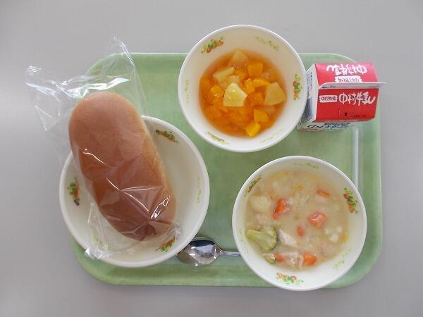 小学部の献立は「黒糖パン、冬野菜のクリーム煮、フルーツジュレ」でした。