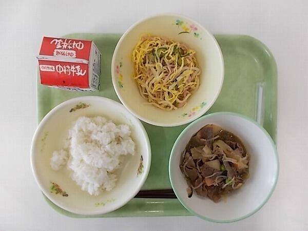小中学部同じ献立で「麦ご飯、牛丼、冷やし中華サラダ」でした。