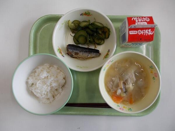 中学部の献立は「麦ごはん、豚汁、いわしの甘露煮、昆布和え」でした。