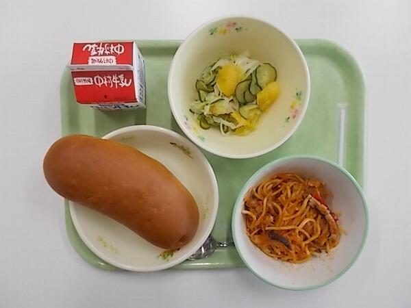 小中学部同じ献立で「ミニ黒糖パン、ひむかナポリタン、夏みかんのサラダ」でした。