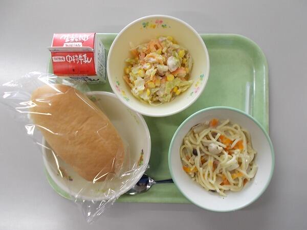 中学部の献立は「コッペパン、チキンのクリームスパゲッティ、コールスロー」でした。