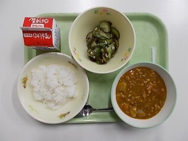 小中学部同じ献立で「白ご飯、ひき肉と豆のカレー、もずくの酢の物」でした。