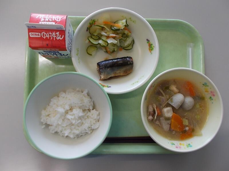 中学部の献立は「麦御飯、豚汁、さんましょうが煮、豚肉のごまマヨネーズ和え」でした。