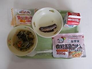 今日の献立は「救給五目ごはん 大根葉のみそ汁 いわしの甘露煮 みかんクレープ」でした。