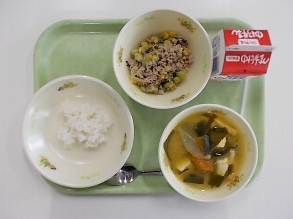 小中学部同じ献立で「麦ごはん、そぼろ丼、カボチャの味噌汁」でした。