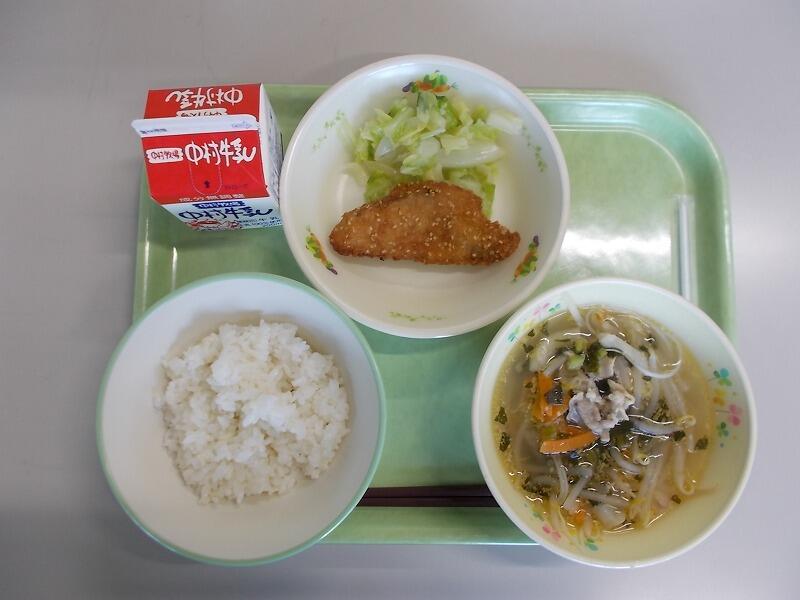 中学部の献立は「麦御飯、ケールスープ、あじごまフライ、ゆでキャベツ」でした。