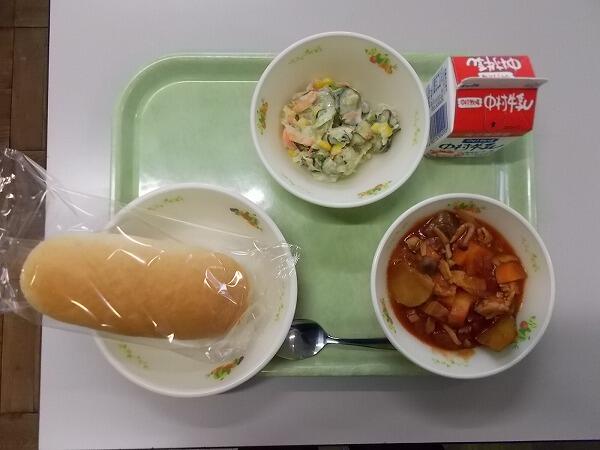 小学部の献立は「コッペパン、鶏肉と野菜のトマト煮、野菜のマヨネーズサラダ」でした。