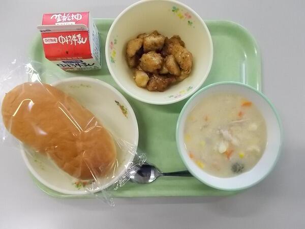 中学部の献立は「ミルクパン、豆乳のポタージュ、フカのレモン揚げ」でした。