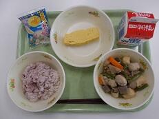 小中学部同じ献立で「減量十二穀ごはん、鶏つくねの煮物、厚焼卵、お月見団子」でした。