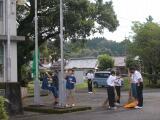 今日も地域の方々に見守られながら、登校してきました。小学生は掲揚台に旗揚げを、中学生は落ち葉掃きをがんばっていました。