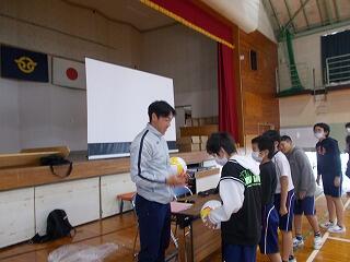 永田一真選手と広報の藤原さんが寄贈に来てくださいました。永田選手から夢を実現するために頑張ってきたことやチームプレーをする中で、「思いやりの心」を大切にしていることをお聞きしました。思いやりの心で人と接してほしいことやチームやクラスづくりをしてほしいとメッセージをいただきました。その後、永田選手と一人ずつボールパスをしました。大変貴重な体験となりました。