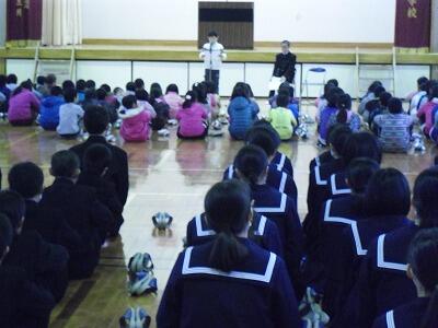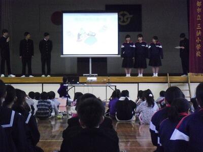 「給食感謝集会」では、中学校の給食委員会の生徒が、食と栄養に関する劇をプレゼンを織り交ぜながら、小学校の低学年にも分かりやすいようにしました。最後に、小学生と中学生の代表が、いつも給食でお世話になっている学校給食センターの皆さんへ書いたお礼のメッセージカードを黒木先生に渡しました。いつもおいしい給食をありがとうございます。