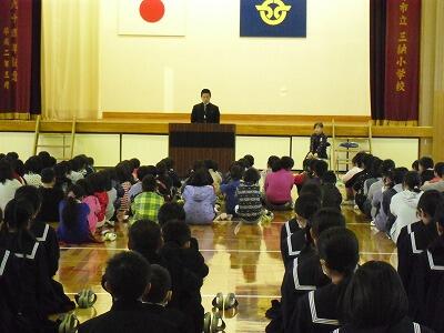 1月14日(木)に、全校で「火災対応の避難訓練」をしました。校内放送後、2分あまりで全員無事に運動場に避難できました。その後、西都市消防本部の方に次のようなお話をしていただきました。