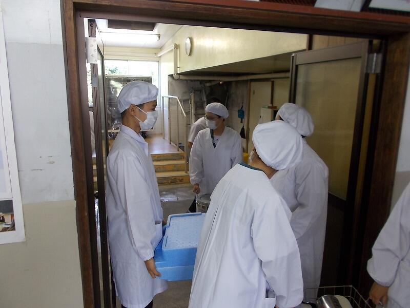 中学部の給食当番の様子です。給食室から各教室へ食器類を運び出すところです。
