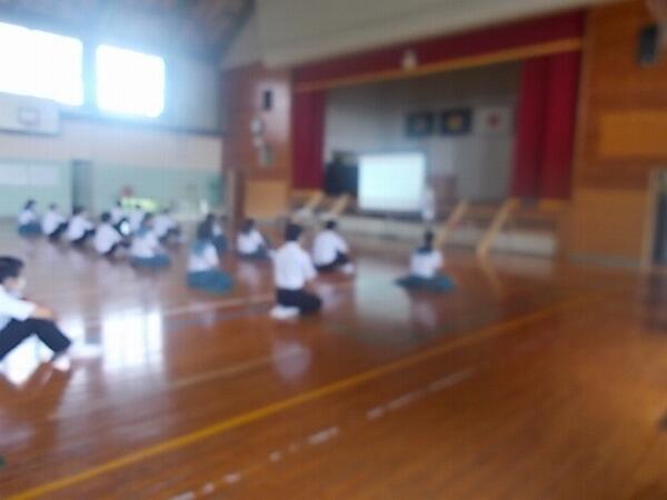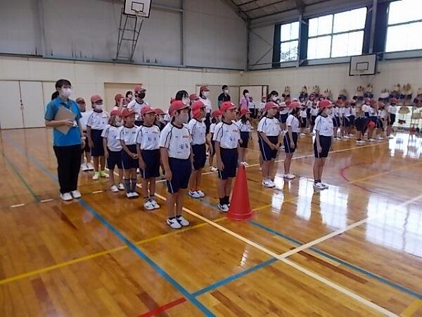 運動会に向けて1回目の全校体育が行われました。雨だったので、体育館と多目的ホールに分かれて行いました。最初は小中別に集合してこの時間の学習の流れをつかみます。
