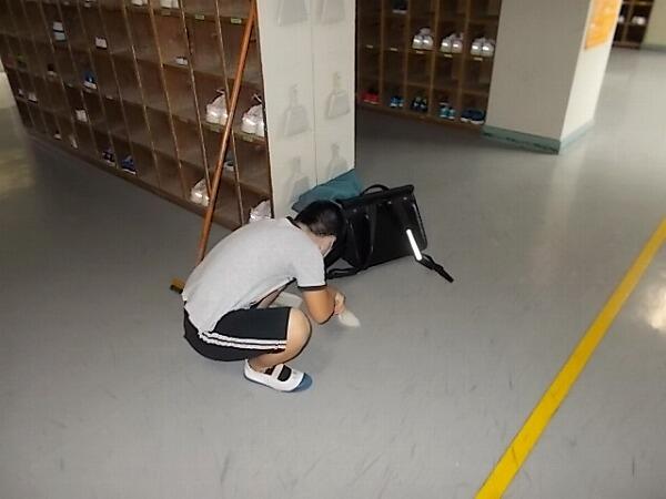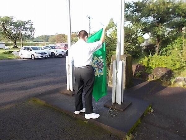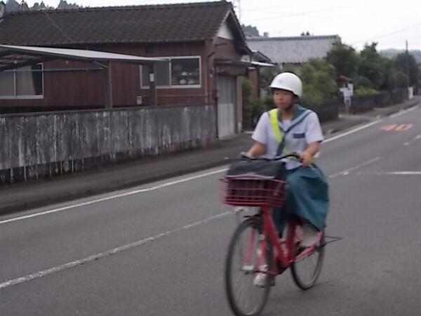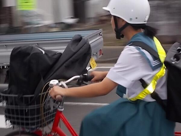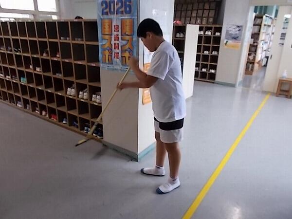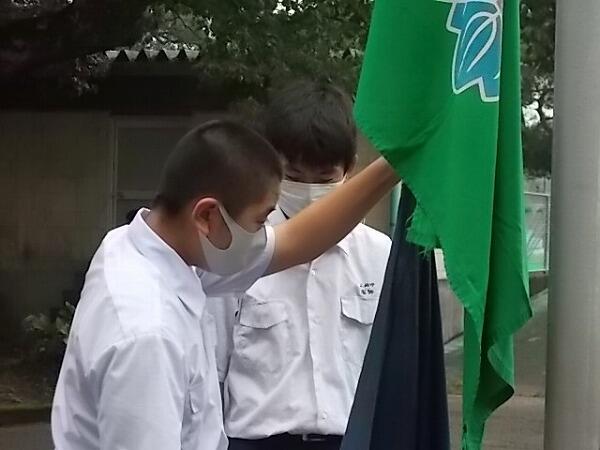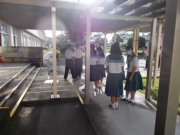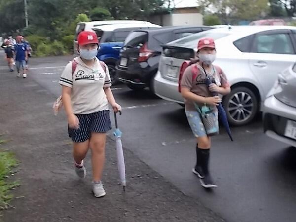 今朝の登校の様子です。女子バレーボール部と軟式野球部の生徒が台風の後片付けもしました。